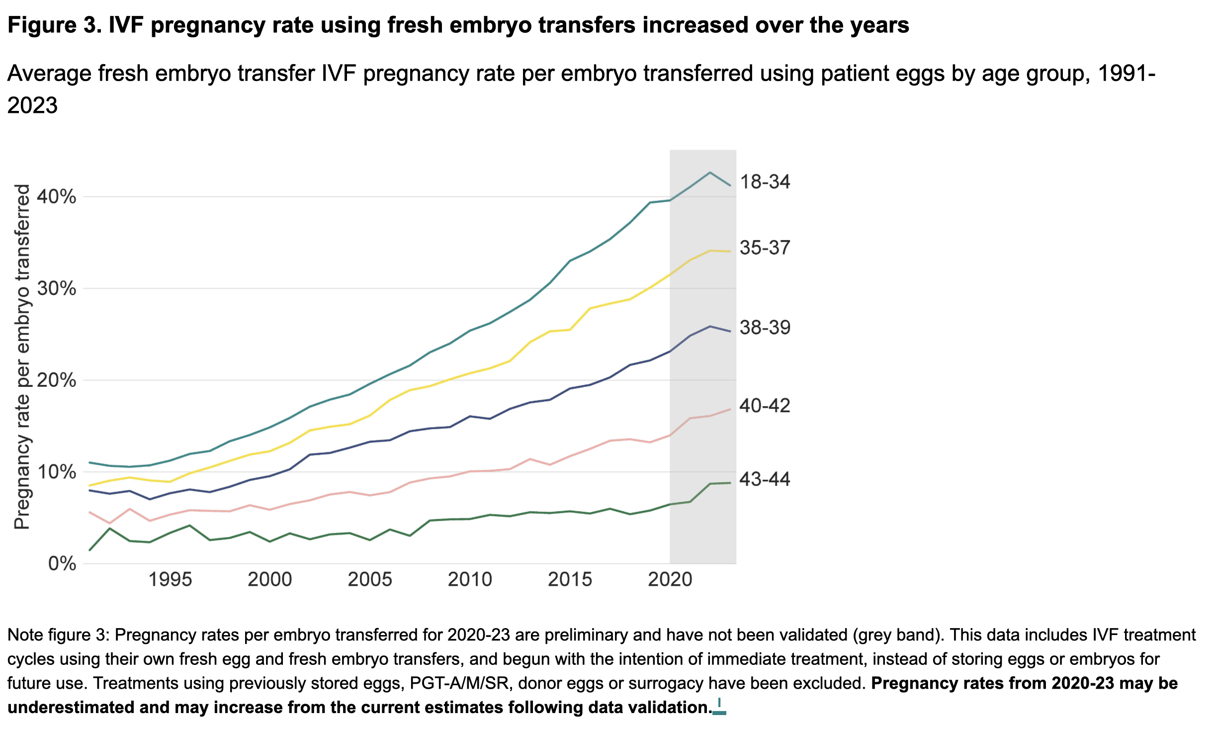 The average age of first-time mothers across the EU increased from 27.6 years in 2006 to 30.2 years in 2022, and the mean age of childbearing has been increasing consistently in Europe since the 1980s. Women under 30 have an 85% chance of conceiving within one year, compared to 66% by age 35 and 44% by age 40, and fertility decreases dramatically after this.
